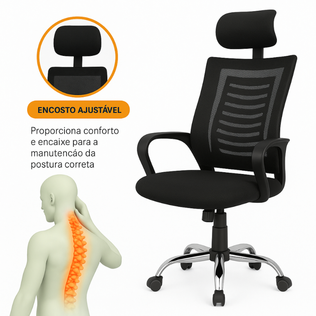 Design que favorece a postura correta, aliviando a pressão sobre a região lombar e prevenindo dores nas costas.