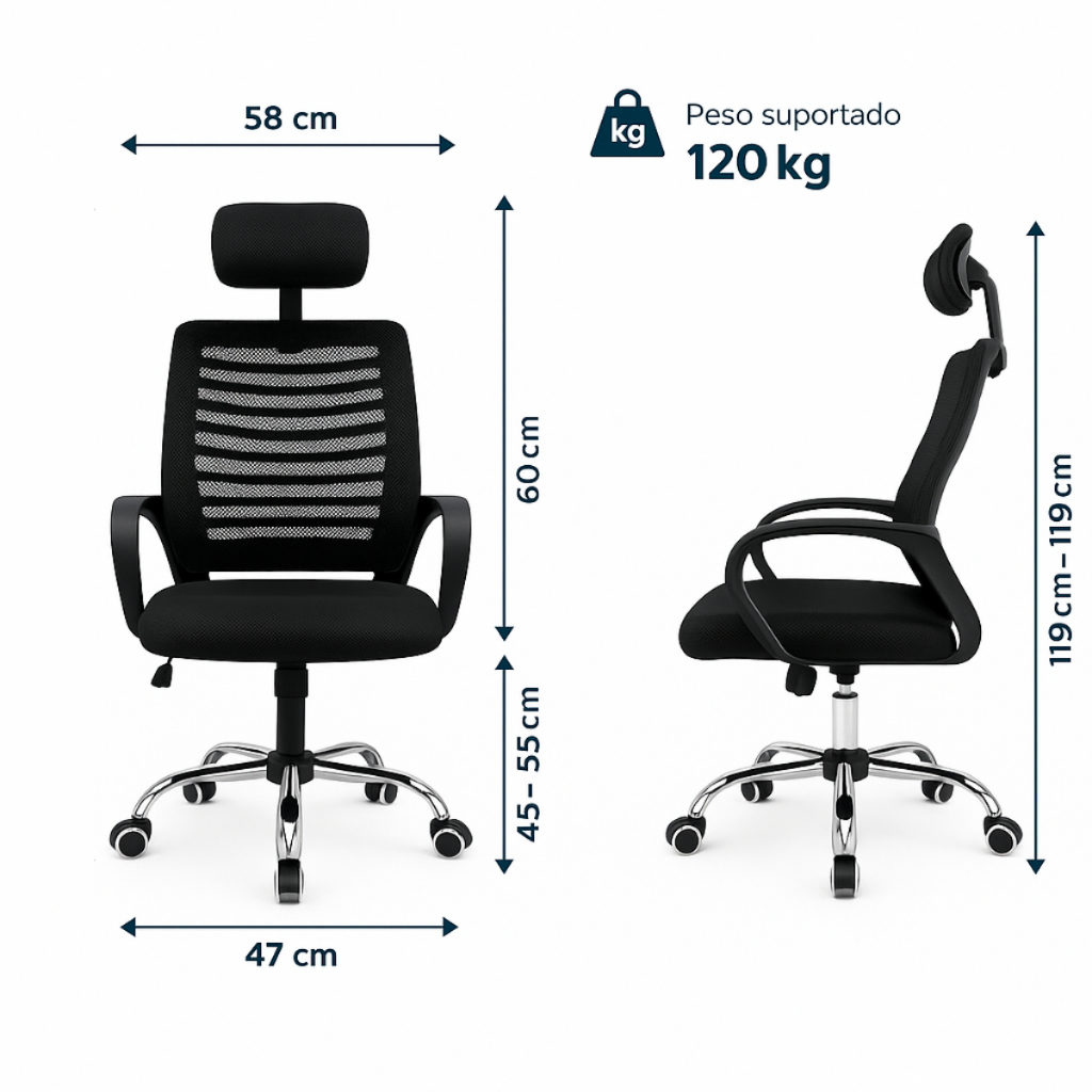 Experimente máxima ergonomia e sofisticação com a Cadeira de Escritório Presidente . Projetada para proteger sua coluna, apoiar o pescoço e oferecer conforto prolongado, é perfeita para home office, escritórios corporativos e ambientes de estudo .